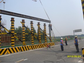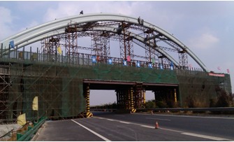1、海青鐵路跨威烏高速公路64米系桿拱橋于2012年5月18日開工,通過預制條基、鋼管法蘭及螺帽調(diào)垂直度等技術,過車門洞施工用7天時間,就正?;謴徒煌?。