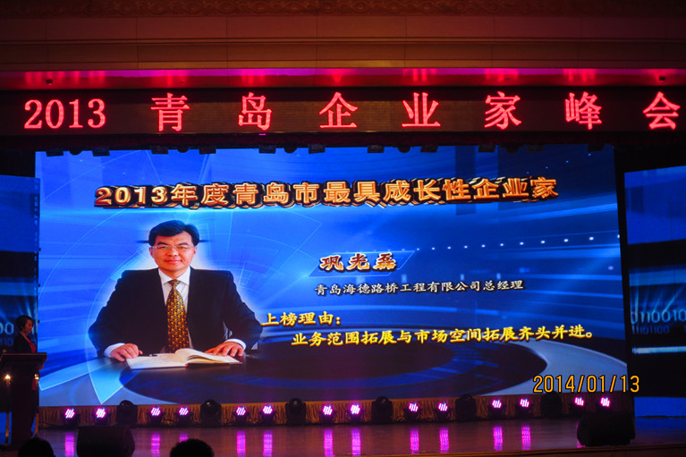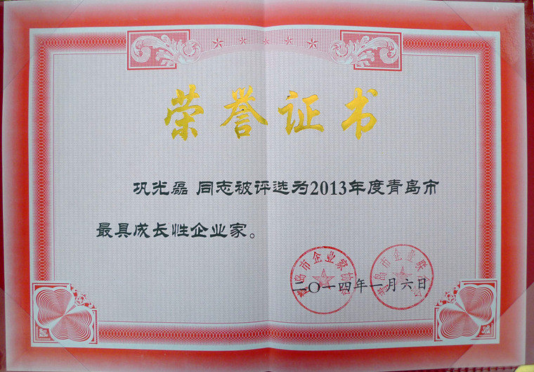 會(huì)議還表彰了2013年度(第十六屆)青島市優(yōu)秀企業(yè)家和最具成長性企業(yè)家,發(fā)布了2013年度青島企業(yè)100強(qiáng)、制造業(yè)企業(yè)100強(qiáng)、服務(wù)業(yè)企業(yè)50強(qiáng)排行榜和首屆青島市社會(huì)責(zé)任示范企業(yè)名單。我公司總經(jīng)理鞏光磊榮膺“青島市最具成長性企業(yè)家”的光榮稱號(hào)。
