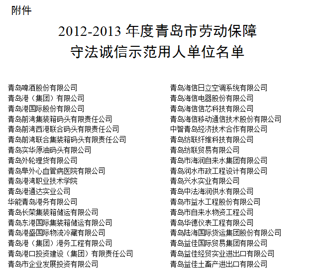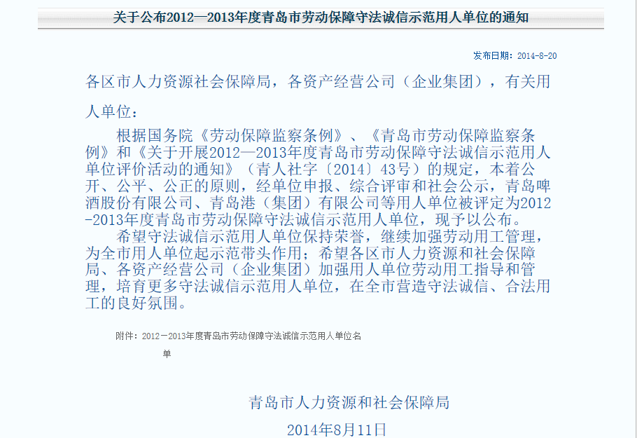 根據(jù)《勞動保障監(jiān)察條例》、《青島市勞動保障監(jiān)察條例》和《青島市勞動保障守法誠信示范用人單位評價辦法》等文件規(guī)定,我總公司和全資子公司青島匯泉勞務(wù)工程有限公司在青島市人力資源和社會保障局組織的2012-2013年度青島市勞動保障守法誠信示范用人單位評價活動中順利獲選,這也是總公司自去年獲選后再次獲評該殊榮。