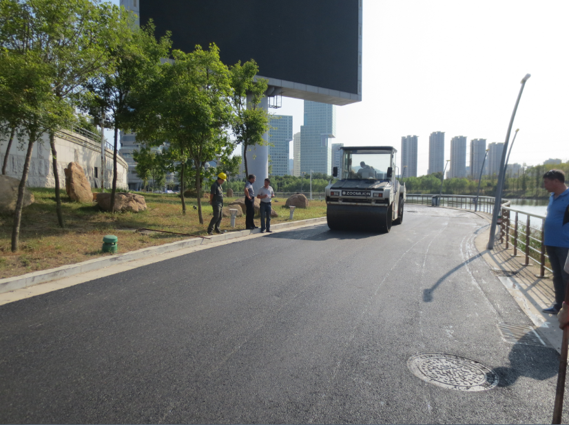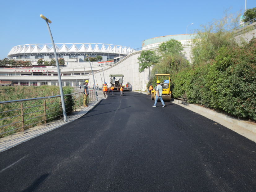 環(huán)湖路位于國信體育場游泳跳水館旁,道路全長625米,為體育場內(nèi)部主要道路之一?,F(xiàn)狀道路面層為3cm厚彩色強固混凝土,起砂、破損嚴重,嚴重影響行車舒適性。本工程為舊路綜合整治工程,設計將車行道舊彩色透水混凝土面層進行銑刨,并鋪設3cm厚AC-10瀝青混凝土