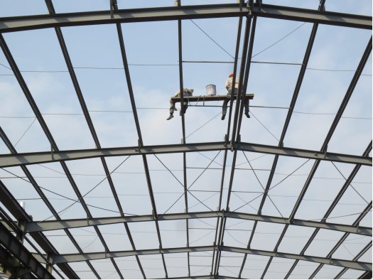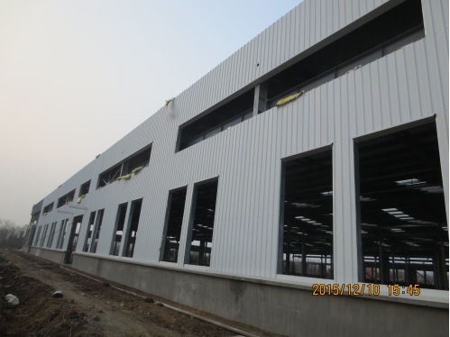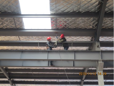 進(jìn)入施工階段后項(xiàng)目部克服冬季施工、高空作業(yè)、交叉施工等難題,嚴(yán)格按照甲方要求及圖紙規(guī)范施工,遇到不合理地方及時(shí)與各方協(xié)商。目前項(xiàng)目進(jìn)度推進(jìn)迅速,經(jīng)過(guò)妥善的施工組織,項(xiàng)目部利用一切機(jī)會(huì)追趕工期,已順利完成吊梁安裝、涂刷防火漆、架設(shè)落水管、安裝屋面瓦和墻面瓦等重要工序。目前正進(jìn)行墻面門窗包邊及門窗的制作安裝工作,同時(shí)項(xiàng)目部積極籌備各項(xiàng)收尾項(xiàng)目的準(zhǔn)備工作,力爭(zhēng)12月下旬順利竣工。