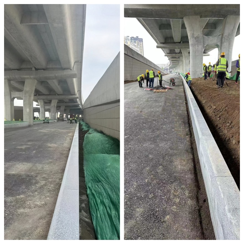 集團(tuán)承建的重慶高架路4標(biāo)段項(xiàng)目總工徐晨星向與會(huì)人員介紹了路沿石、人行道精細(xì)化施工及由集團(tuán)子公司青島海德信達(dá)新型材料科技有限公司生產(chǎn)的新型仿石路沿石、仿石路面磚等新型環(huán)保建材,還展示了集團(tuán)自主研發(fā)的移動(dòng)式切割粉塵收集房并就市政工程基礎(chǔ)建設(shè)相關(guān)問(wèn)題進(jìn)行了深入探討和交流。隨后,與會(huì)人員實(shí)地查看了道路工程路基壓實(shí),二灰基層及瀝青路面攤鋪、檢查井安裝、新型檢查井應(yīng)用等精細(xì)化施工和班組建設(shè)情況。