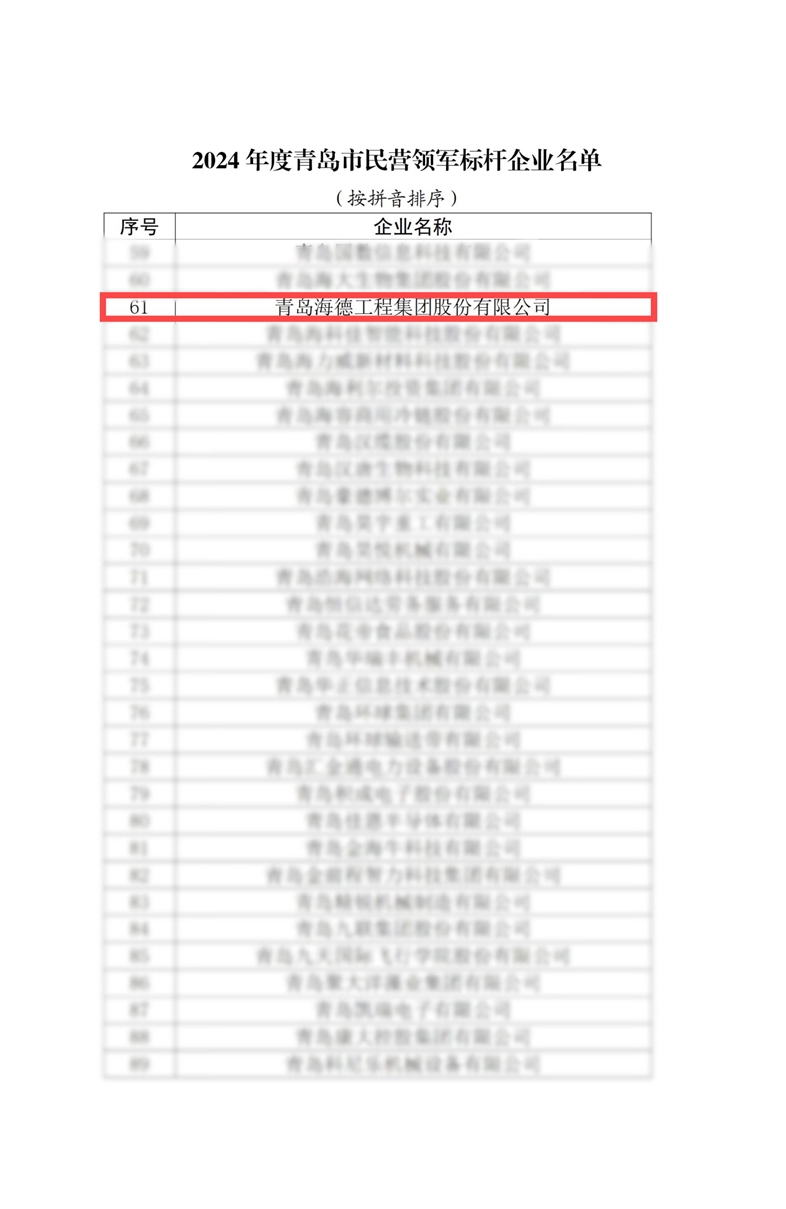 12月13日,青島市民營經(jīng)濟(jì)局發(fā)布《關(guān)于公布2024年度青島市民營領(lǐng)軍標(biāo)桿企業(yè)名單的通知》,集團(tuán)公司成功入選。這是集團(tuán)公司自2022年獲評首批“青島市民營領(lǐng)軍標(biāo)桿企業(yè)”之后連續(xù)第三年榮膺該稱號。