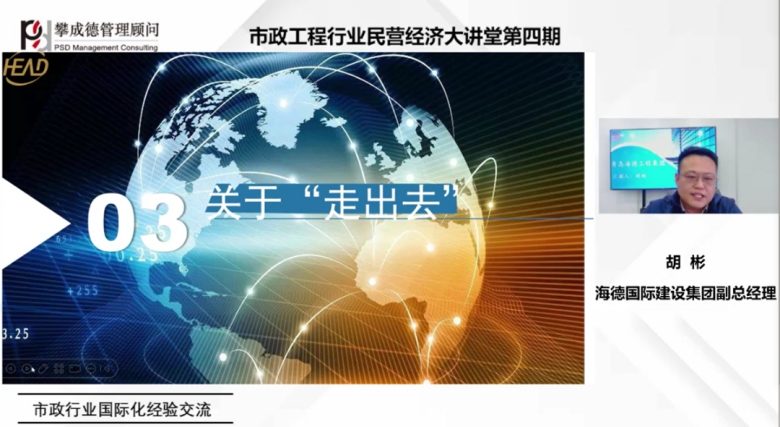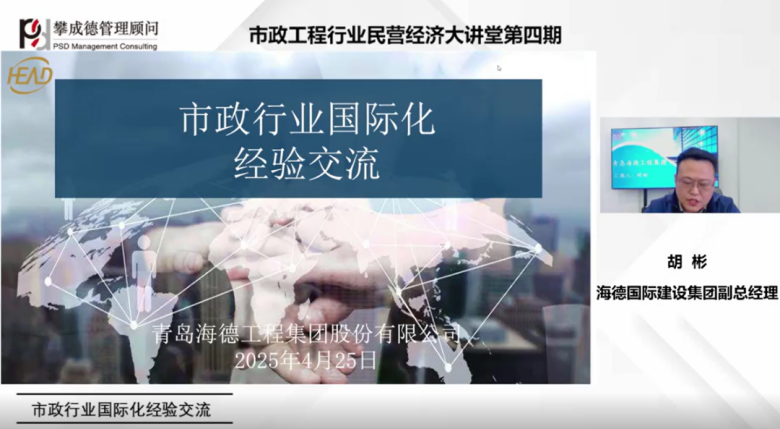 近日,集團(tuán)子集團(tuán)海德國(guó)際建設(shè)集團(tuán)副總經(jīng)理胡彬作為主講講師,應(yīng)邀參加了中國(guó)市政協(xié)會(huì) 2025 年第四期市政工程行業(yè)民營(yíng)經(jīng)濟(jì)大講堂。此次大講堂以線上直播的形式舉行,吸引了多家市政企業(yè)在線收聽、觀看。