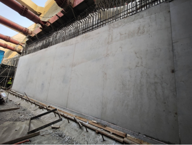 為達到優(yōu)質(zhì)目標,項目部成立專項小組在主體結(jié)構(gòu)施工施工前策劃飾面高性能混凝土施工措施,施工過程項目管理專項小組全程參與,施工前進行交底、全流程監(jiān)督、拆模后總結(jié)復盤,最終交出10塊側(cè)墻初驗評價A級9塊、B級1塊合格率90%的成績。