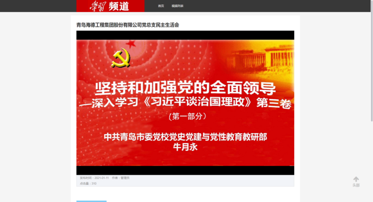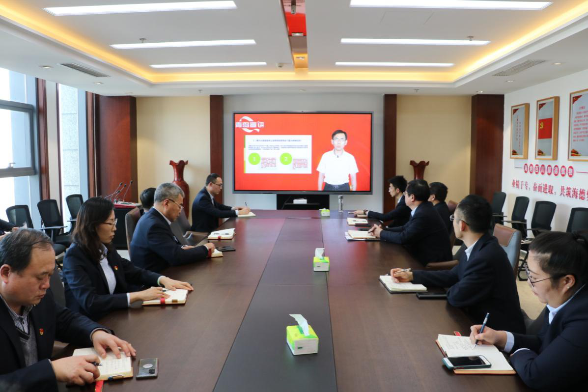 2021年1月12日,集團公司組織全體黨員開展學習《習近平談治國理政》(第三卷)和民主生活會活動,通過“學習強國”的“學習頻道”網(wǎng)絡直播形式,收聽了中共青島市委黨校牛月永教授的《堅持和加強黨的全面領導》網(wǎng)絡黨課。
