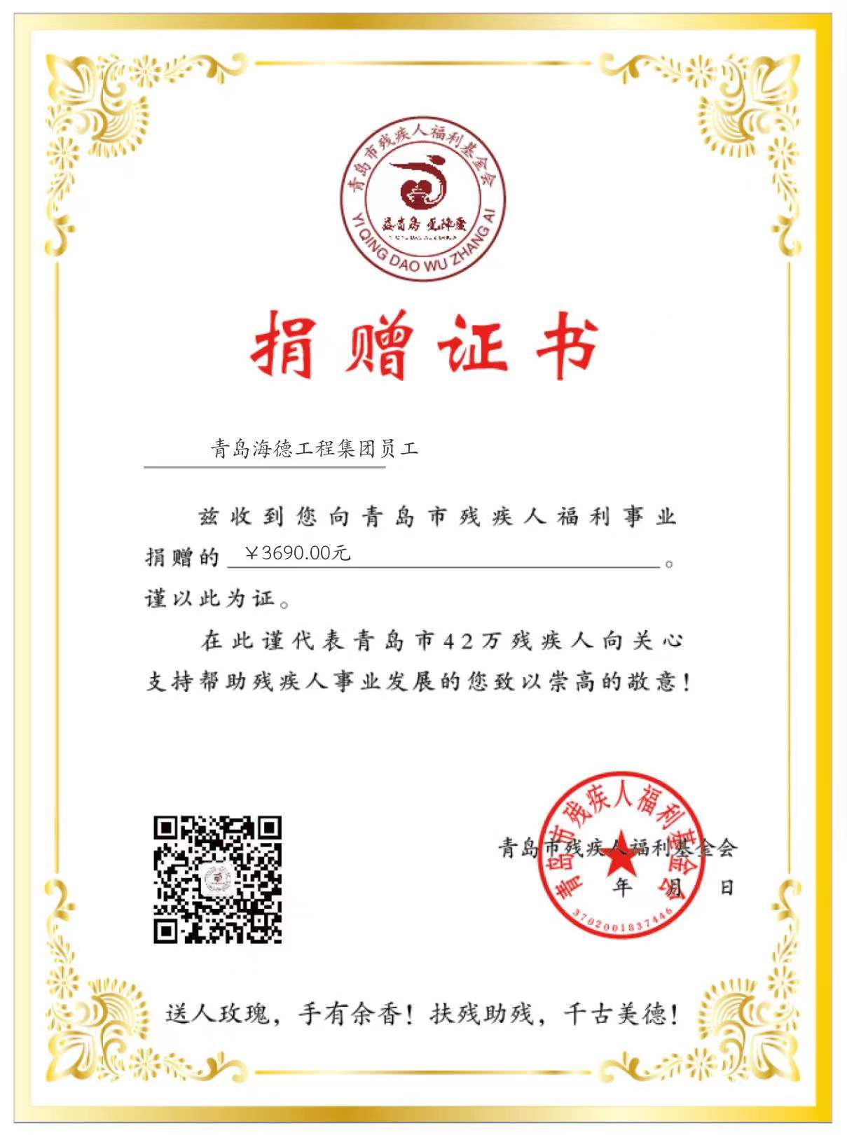 在新年到來之際,在辭舊迎新的歲月里,剛脫離貧困的殘疾人兄弟姐妹們?nèi)匀幻媾R著一些現(xiàn)實(shí)困難。為幫助殘疾人過一個(gè)歡樂祥和的新年,青島市殘疾人福利基金會(huì)發(fā)起了“我捐一點(diǎn)錢,幫助殘疾人迎新年”活動(dòng),募捐款項(xiàng)將全部用于幫扶殘疾人解決日常生活、信息交流等方面的困難?;顒?dòng)發(fā)起后,集團(tuán)公司積極響應(yīng)號(hào)召,組織發(fā)動(dòng)員工捐款,共募得款項(xiàng)3690元。